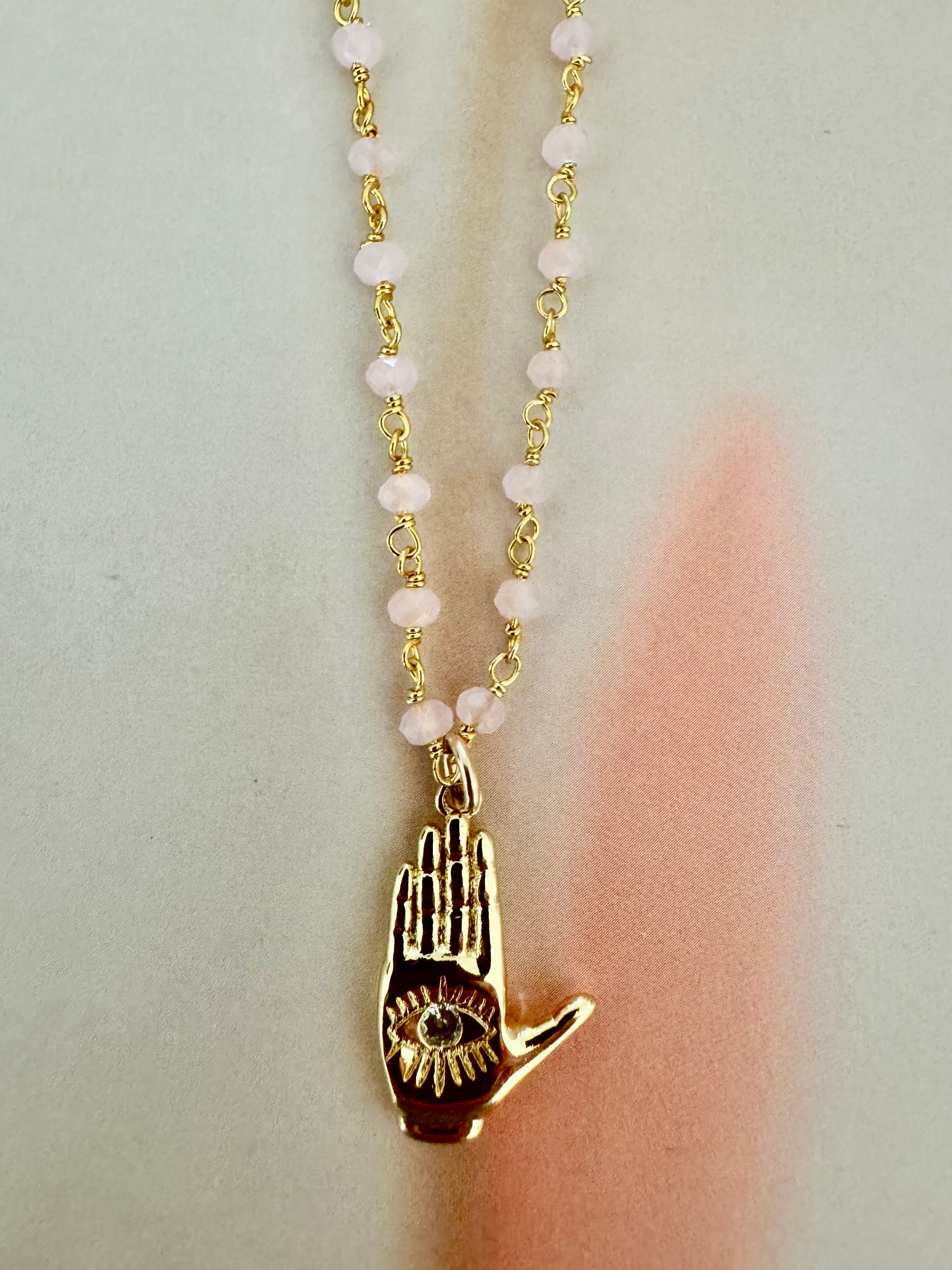 GOLD FILLED HAMSA CHARM ON PINK QUARTZ AND GOLD PLATED CHAIN