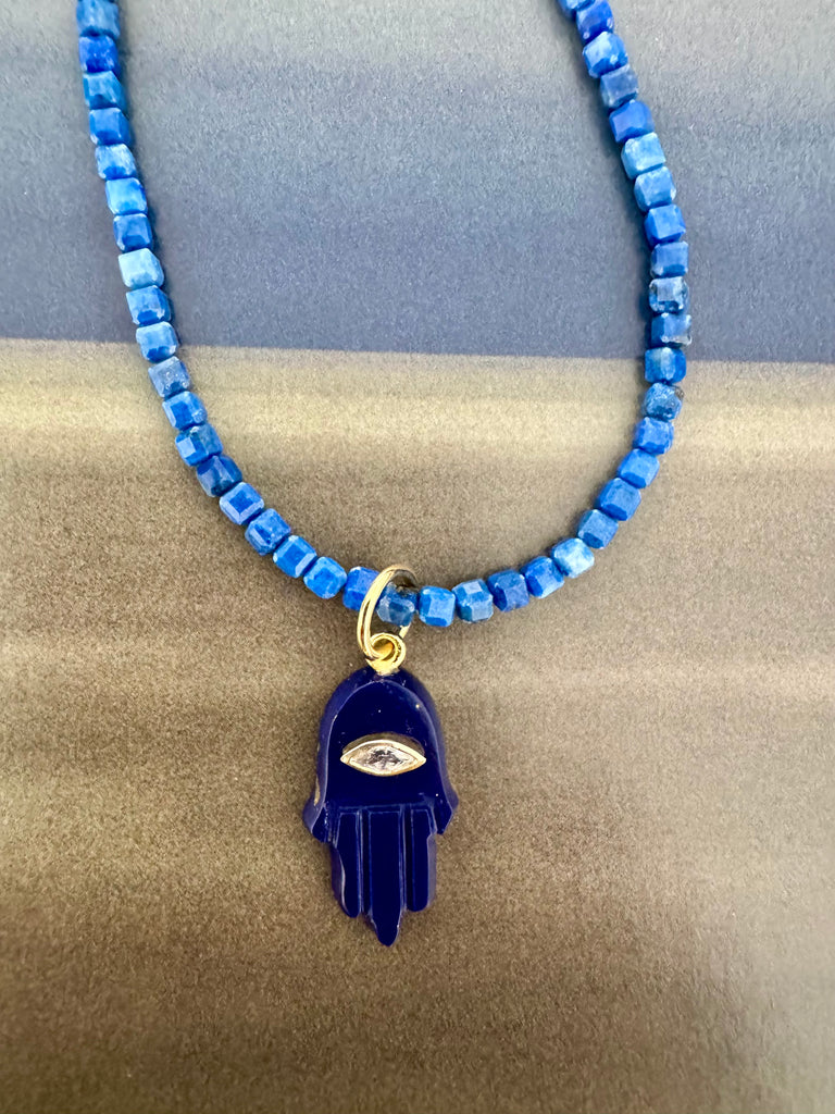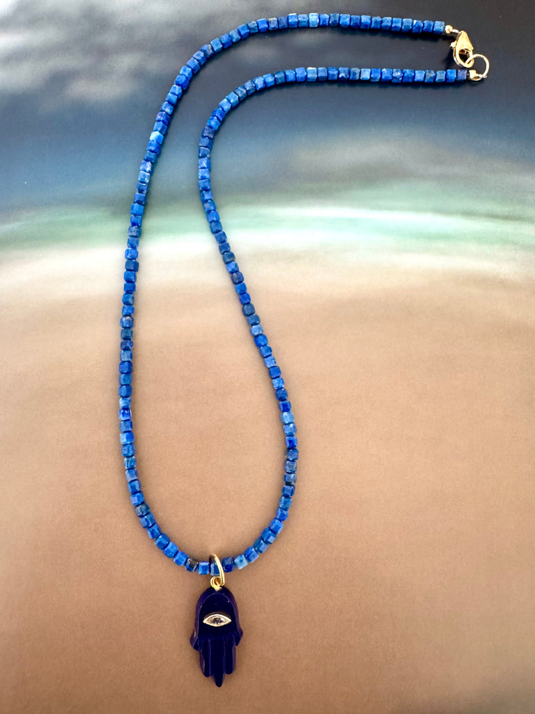 BLUE HAMSA PENDANT WITH CUBED LAPIS BEADS